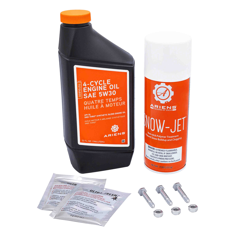 • Kit includes (1) 32 oz bottle of 5W-30 engine oil, (2) packets of fuel stabilizer, (3) shear bolts with nuts and (1) 11 oz aerosol can of Snow-Jet